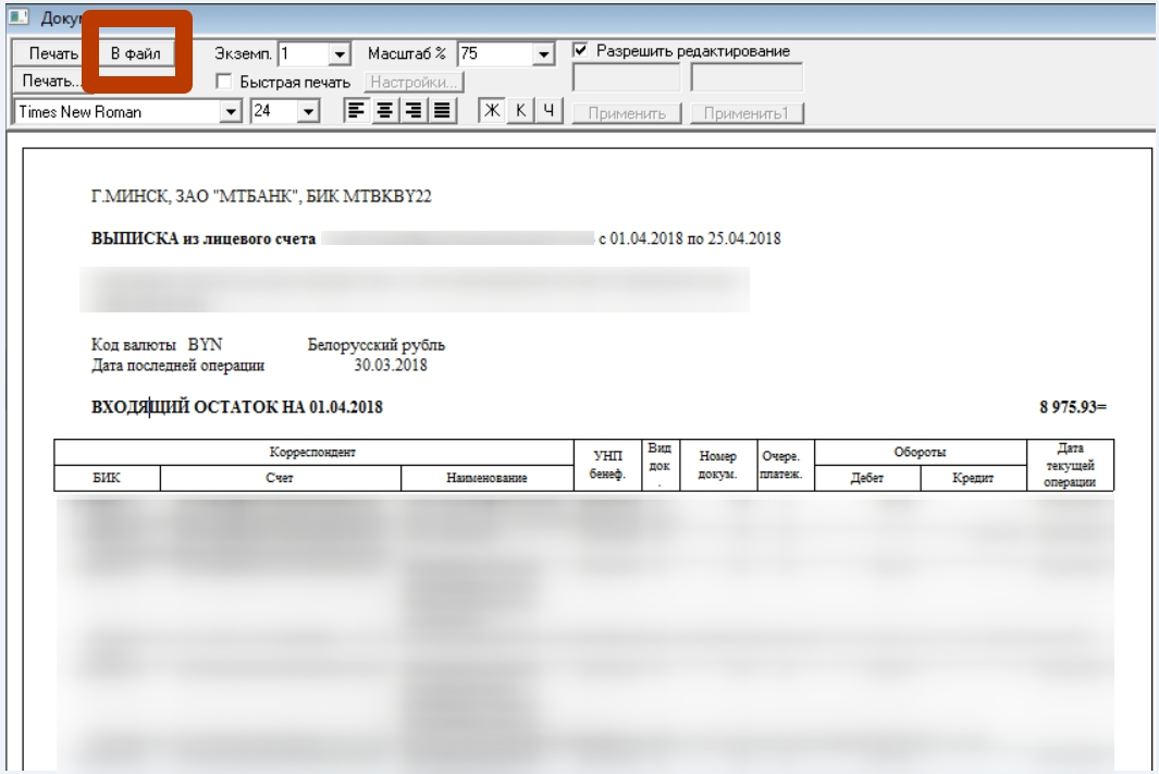 А) в формате .rtf. Для этого щелкните 2 раза мышкой по выписке. Откроется окно. Нажмите на кнопку, как показано на картинке и сохраните в папку.
