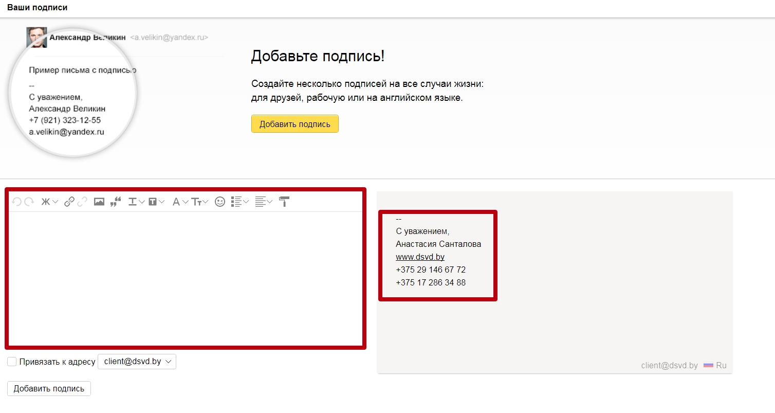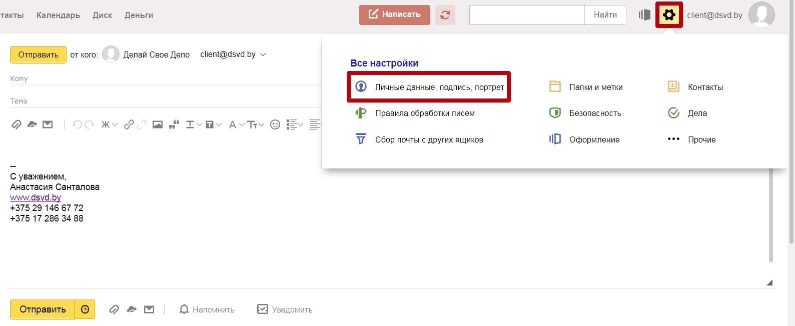 4 Чтобы в каждом Вашем письме отображались Ваши контактные данные, необходимо: Зайти в настройки, найти “Подпись”, добавить текст и сохранить изменения.