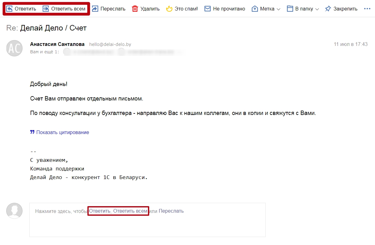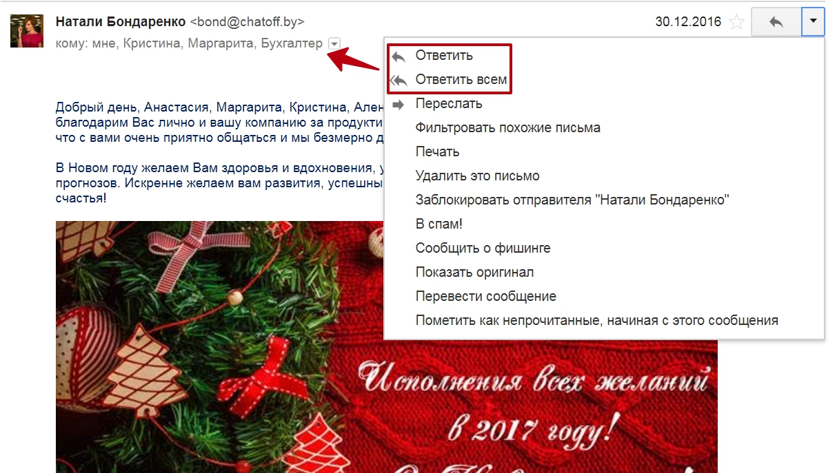 Если вы хотите ответить отправителю письма, а также остальным получателям, то перед тем, как набирать текст, нажмите “Ответить всем”.