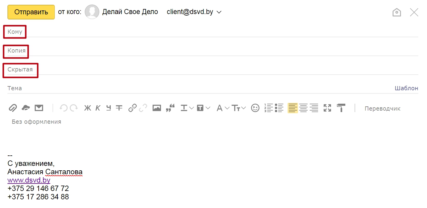Например, Вы пишите письмо своему партнеру и хотите, чтобы для понимания ситуации это письмо также получил Ваш маркетолог. Поэтому, в поле “Кому:” Вы напишите партнера, а в поле “Копия:” своего маркетолога.